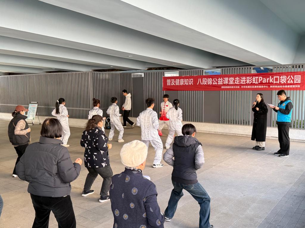 在全民健身国家战略深入开展,“推进运动场地建设,开展全民健身”的背景下。2025年3月20日,运动与健康管理学院大健康工作室联合渭阳西路街道文化站、中华东路社区康体服务中心,于彩虹ParK口袋公园举办“普及健康知识——八段锦公益课堂进社区”的巡回宣讲系列活动。