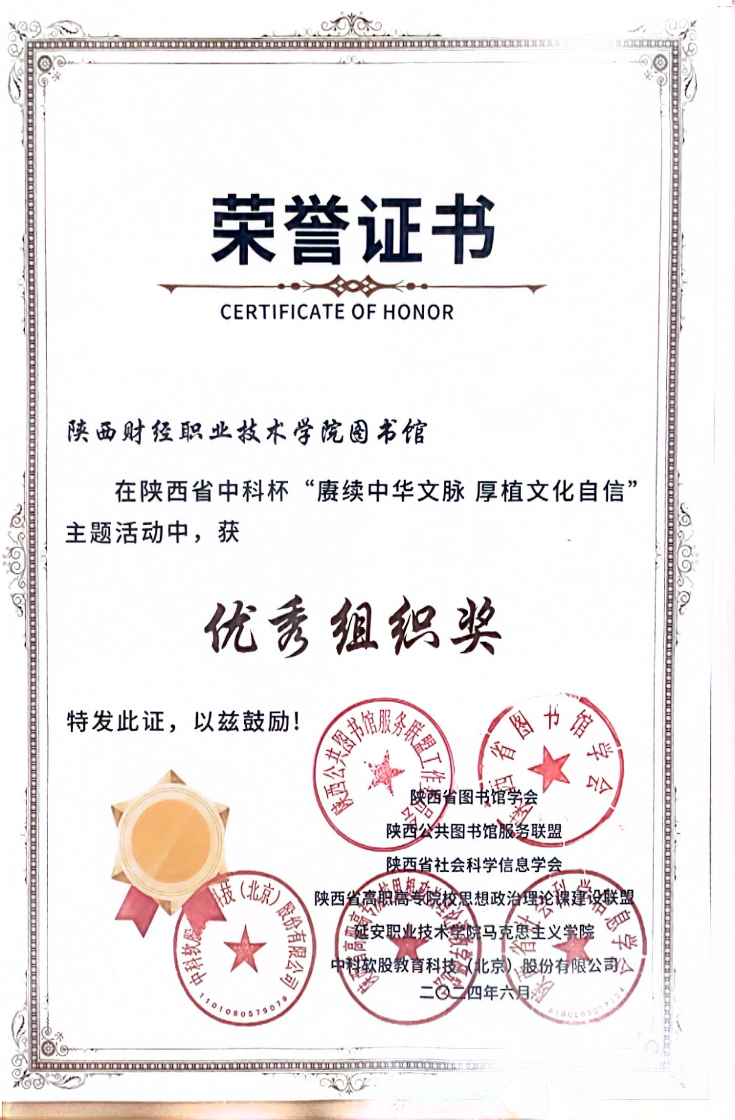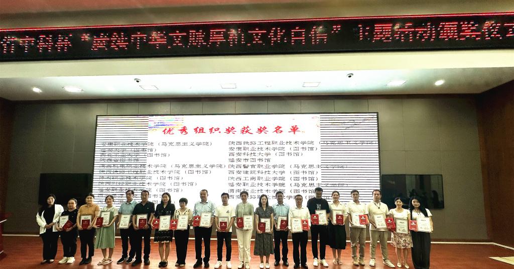 为深入学习贯彻习近平总书记在新时代文化建设方面的新思想新观点新论断,以文化人、培根铸魂,推进文化自信自强,6月14日下午,陕西省中科杯“赓续中华文脉 厚植文化自信”知识竞赛活动活动颁奖仪式在延安市图书馆举行。我校教师李妙娟获优秀指导教师奖、贺华获优秀指导教师奖和教工组优秀奖、雷珍获教工组优秀奖,我校图书馆荣获优秀组织奖。